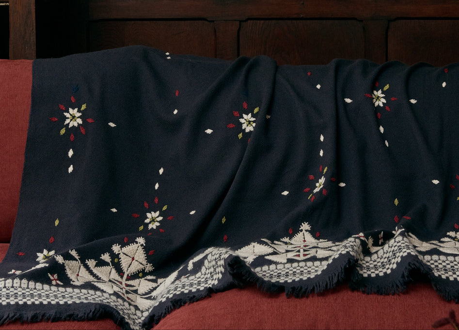 Elzear est un plaid en laine mérinos d'une douceur absolue. Sur sa base d'un bleu profond, un patient travail de tissage et de broderie se déploie : différentes techniques artisanales se mêlent. Les motifs naissent du bout du fil, tandis que les bandes de chaque extrêmité sont tissées à la main. Son inspiration orientale évoque les ornementations riches des trains de nuits du siècle dernier. À poser sur un lit ou à envelopper autour des épaules.