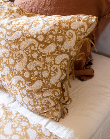 Le velours s’installe pour accueillir la saison froide, porté par sa lumière feutrée. Matière noble et sensible, il réchauffe la maison avec naturel : un sofa cover généreux, une housse en velours lavé ou brodé qui adoucit les lignes, un coussin rebondi qui trouve sa place instinctivement.