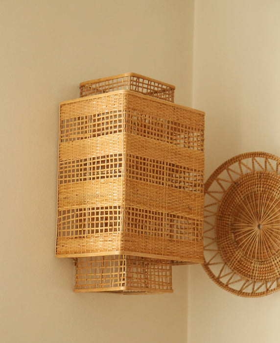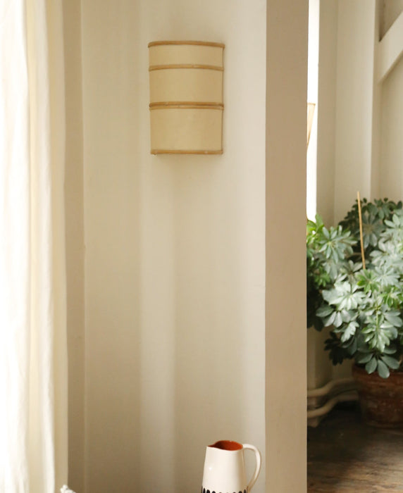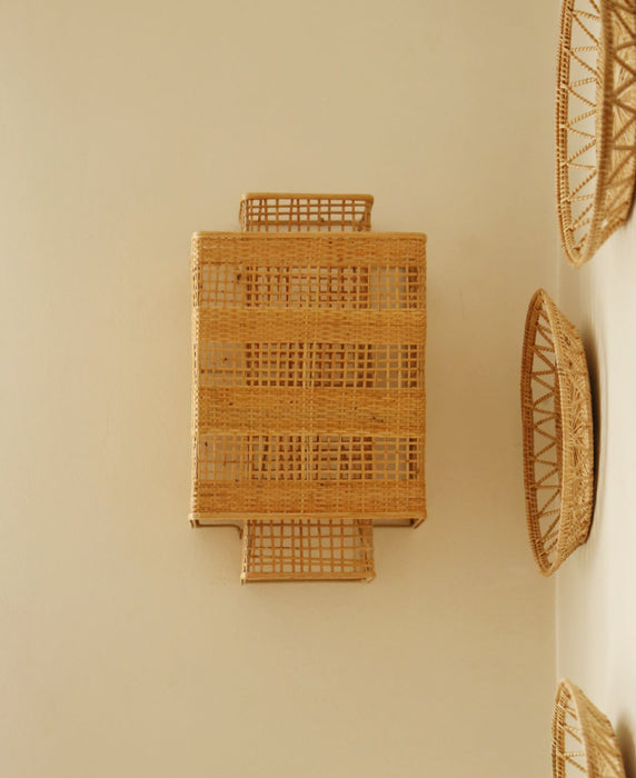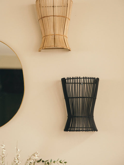 The Ion wall lights diffuse light and catch the eye. With their superb rattan weave, they adorn a wall on their own, whether they are switched off or on. The rattan rods that compose them are first cut with precision, so that they adopt the desired size, then applied and woven into the iron structure. This allows for this unique openwork weave rendering that punctuates the light according to a unique play of stripes.