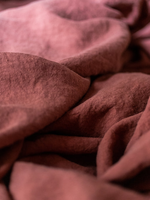 Lies in the excellence of its manufacturing process. The noble and natural linen fiber is harvested and woven in Europe. The fabric is then dyed, washed and softened, to give it this delicately crumpled texture, so voluptuous. The piece dyeing takes place in a second stage and on order, in our French workshop: a bath of color is expertly prepared, the washed linen piece is delicately immersed and slowly soaks up each shade. The dyes are revealed on contact with the fiber and offer a magical rendering: the colors vibrate deeply. Each set is then meticulously studied by us, in order to ensure that the shade is harmonious, even if each remains unique and reveals its own vibrations.