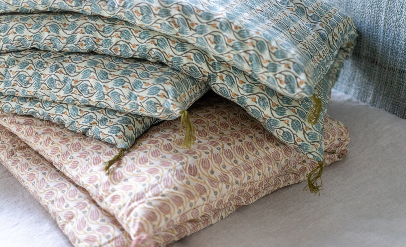 A bed where the thicknesses overlap, where the textures and materials blend with audacity and originality. A cozy, colorful bed, with surprising patterns: Floral inspiration from the Papilio range Unique print, in soft and vibrant hues, from the Magnoli collection, a floral pattern made by hand in block, on a 100% cotton fabric Or the finesse and freshness of the stripes of the Meli range