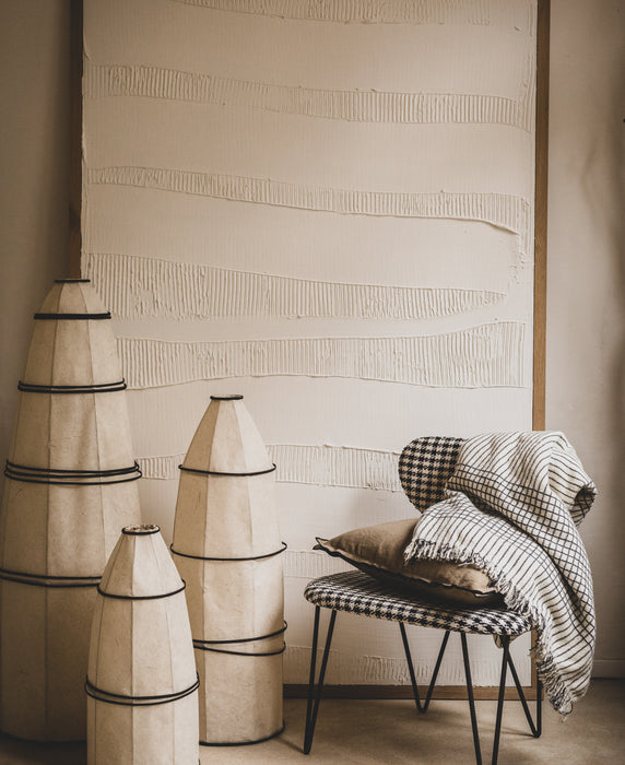 Le bambou et le rotin, utilisés pour la structure et les détails de la lampe, apportent une touche de chaleur et de robustesse. Le bambou, matériau léger et résistant, est travaillé pour former une armature élégante, tandis que le rotin, tressé à la main, vient sublimer les finitions. Ce mariage de matériaux naturels crée une harmonie parfaite entre légèreté et solidité, tout en conférant à la lampe Bell une allure intemporelle et raffinée.