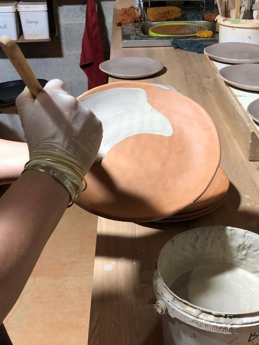 Entirely made in France, guaranteeing exceptional craftsmanship and quality controlled at every stage. Nicolas shapes, paints and enamels each piece by hand — vases, bowls, plates — making each creation unique, a reflection of his artisanal know-how. Each piece undergoes two firings: the first for the engobed biscuit, then a second after painting the stripes with oxide juice and applying the enamel. Between each step, special care is taken to avoid any breakage. Inspired by Italian landscapes, this summer-inspired tableware evokes the sweetness of southern markets with its lemon yellow and olive green stripes, perfectly paired with the cream and turmeric shades of the Koterra range. An invitation to create bright, cheerful, and characterful tables.