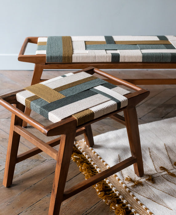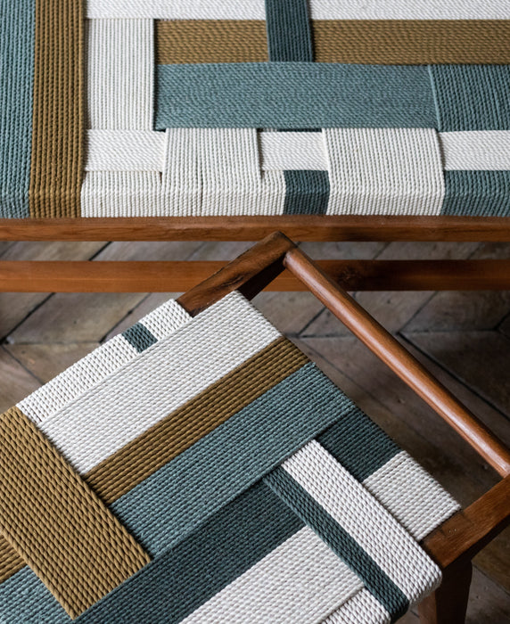 Qu’il soit en version banc ou tabouret, Barma c'est des couleurs parfaitement accordées, un tressage réalisé à la main, un bois d’acacia plein de caractère. Son assise est presque comme une petite œuvre d’art...Un objet que nous aimons profondément.