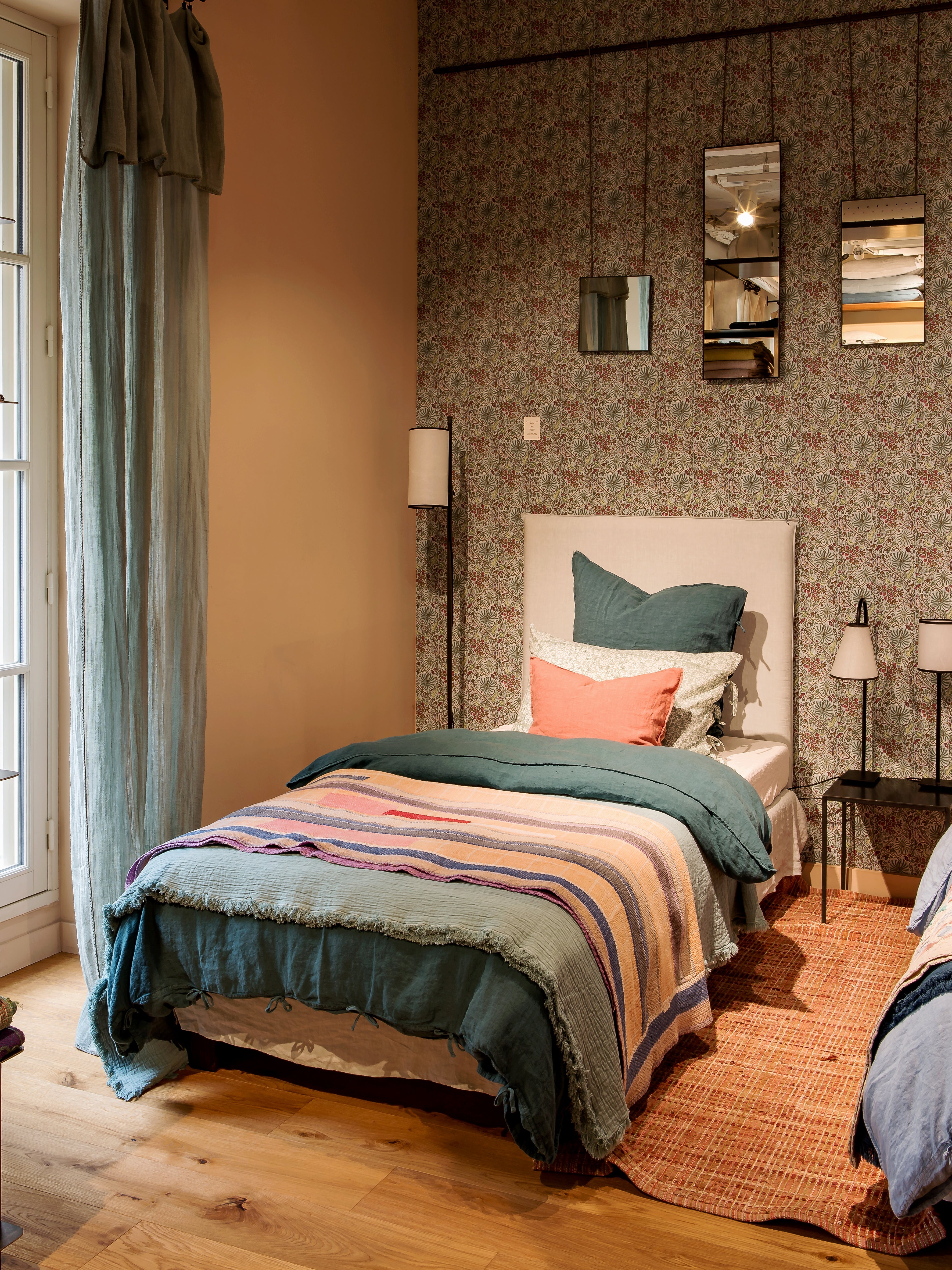 Réside dans l’excellence de son procédé de fabrication. La fibre de lin, noble et naturelle, est récoltée et tissée en Europe. Le tissu est ensuite teint, lavé et adouci, pour lui apporter cette texture délicatement froissée, si voluptueuse. La teinture sur pièce intervient dans un second temps et sur commande, dans notre atelier français : un bain de couleur est savamment préparé, la pièce de lin lavé y est délicatement plongée et s’imprègne doucement de chaque nuance. Les teintures se révèlent au contact de la fibre et offrent un rendu magique : les couleurs vibrent en profondeur. Chaque parure est ensuite minutieusement étudiée par nos soins, afin de s’assurer que la teinte est harmonieuse, même si chacune reste unique et révèle ses propres vibrations.