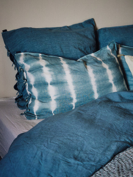 Réside dans l’excellence de son procédé de fabrication. La fibre de lin, noble et naturelle, est récoltée et tissée en Europe. Le tissu est ensuite teint, lavé et adouci, pour lui apporter cette texture délicatement froissée, si voluptueuse. La teinture sur pièce intervient dans un second temps et sur commande, dans notre atelier français : un bain de couleur est savamment préparé, la pièce de lin lavé y est délicatement plongée et s’imprègne doucement de chaque nuance. Les teintures se révèlent au contact de la fibre et offrent un rendu magique : les couleurs vibrent en profondeur. Chaque parure est ensuite minutieusement étudiée par nos soins, afin de s’assurer que la teinte est harmonieuse, même si chacune reste unique et révèle ses propres vibrations.