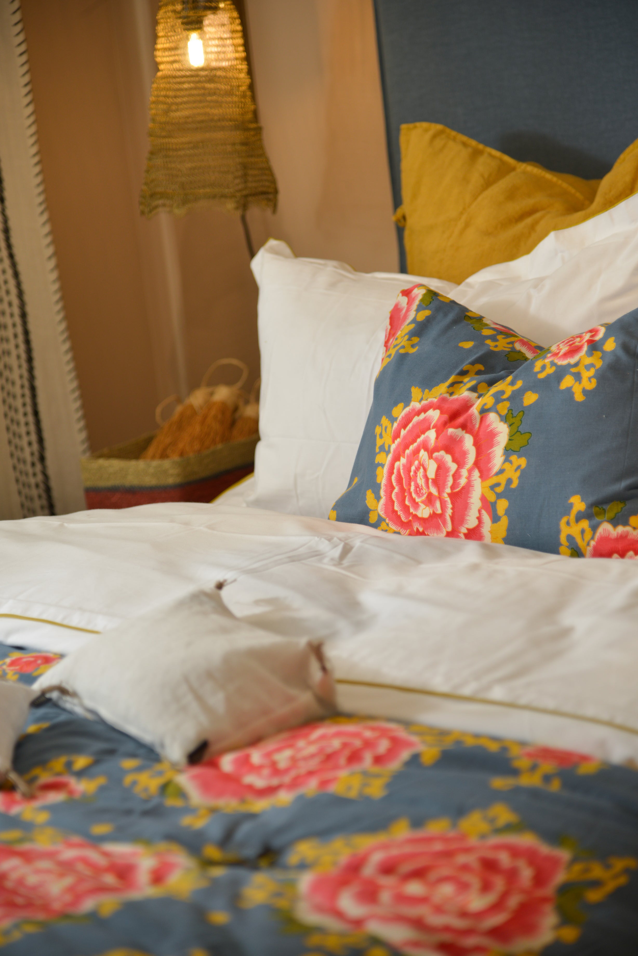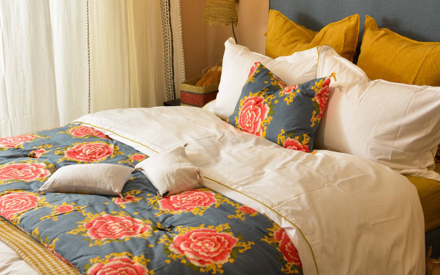 L’imprimé de la housse de coussin Liao semble hérité des documents textiles du 19e siècle, aux motifs floraux généreux et vivants.