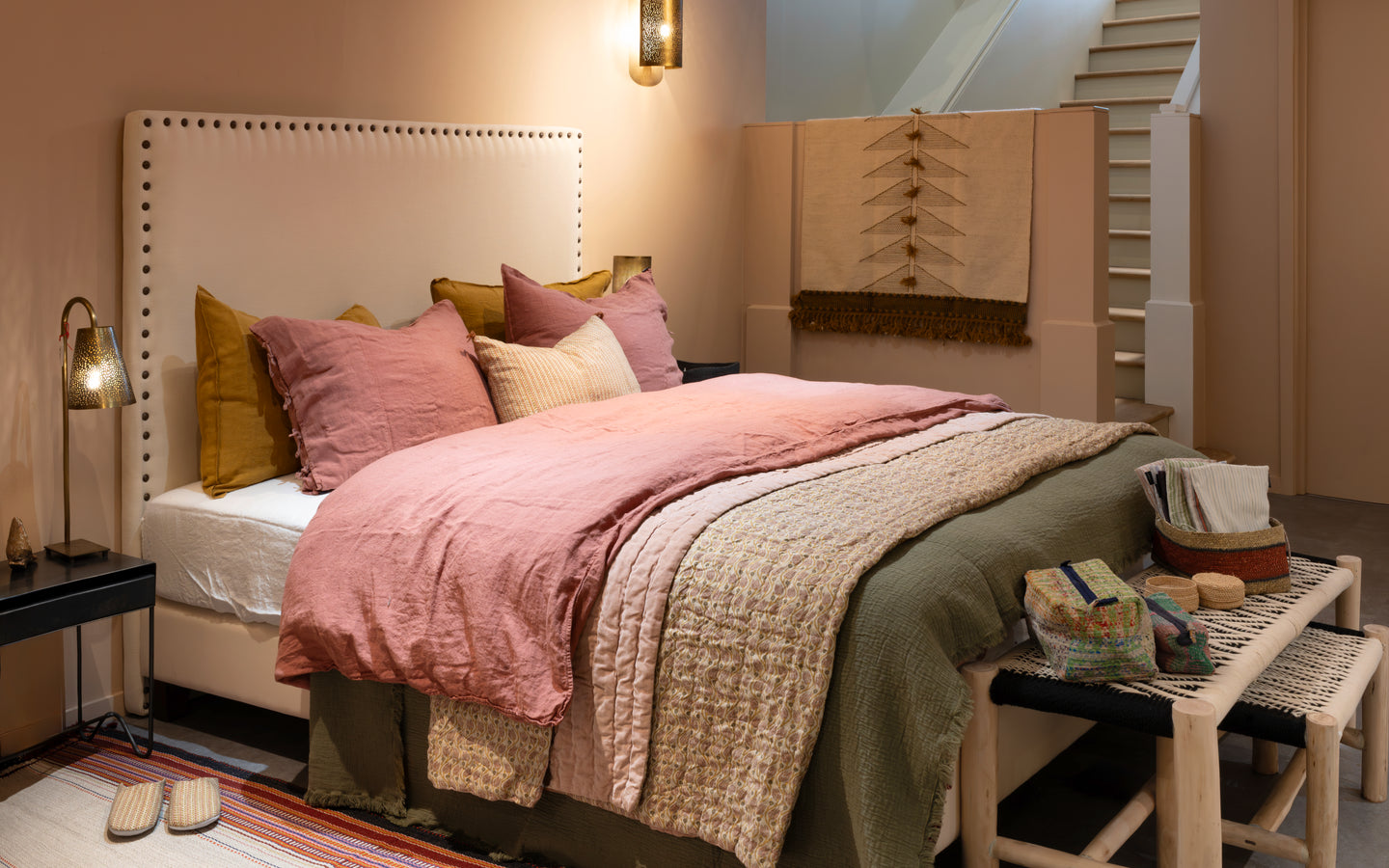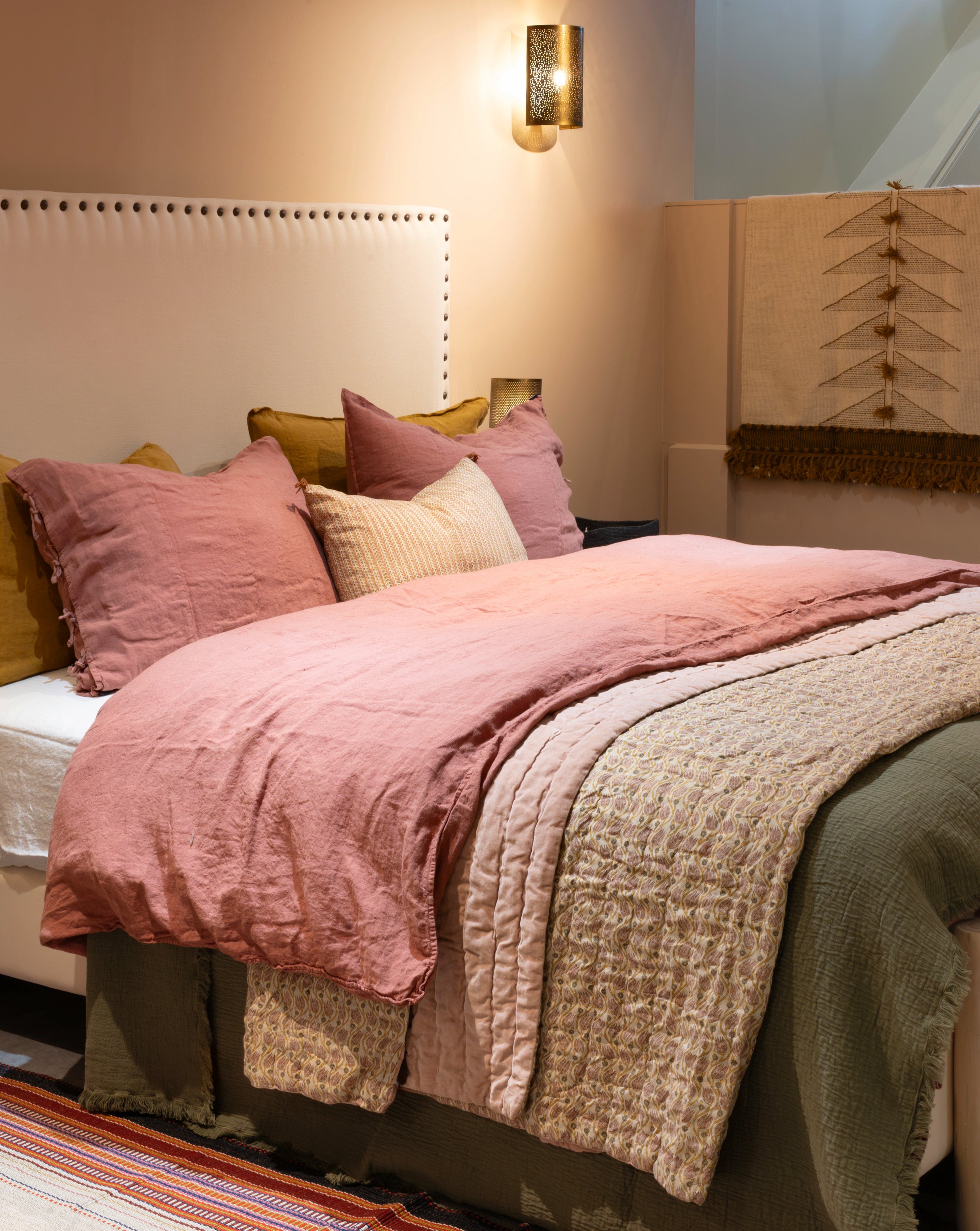 Réside dans l’excellence de son procédé de fabrication. La fibre de lin, noble et naturelle, est récoltée et tissée en Europe. Le tissu est ensuite teint, lavé et adouci, pour lui apporter cette texture délicatement froissée, si voluptueuse. La teinture sur pièce intervient dans un second temps et sur commande, dans notre atelier français : un bain de couleur est savamment préparé, la pièce de lin lavé y est délicatement plongée et s’imprègne doucement de chaque nuance. Les teintures se révèlent au contact de la fibre et offrent un rendu magique : les couleurs vibrent en profondeur. Chaque parure est ensuite minutieusement étudiée par nos soins, afin de s’assurer que la teinte est harmonieuse, même si chacune reste unique et révèle ses propres vibrations.
