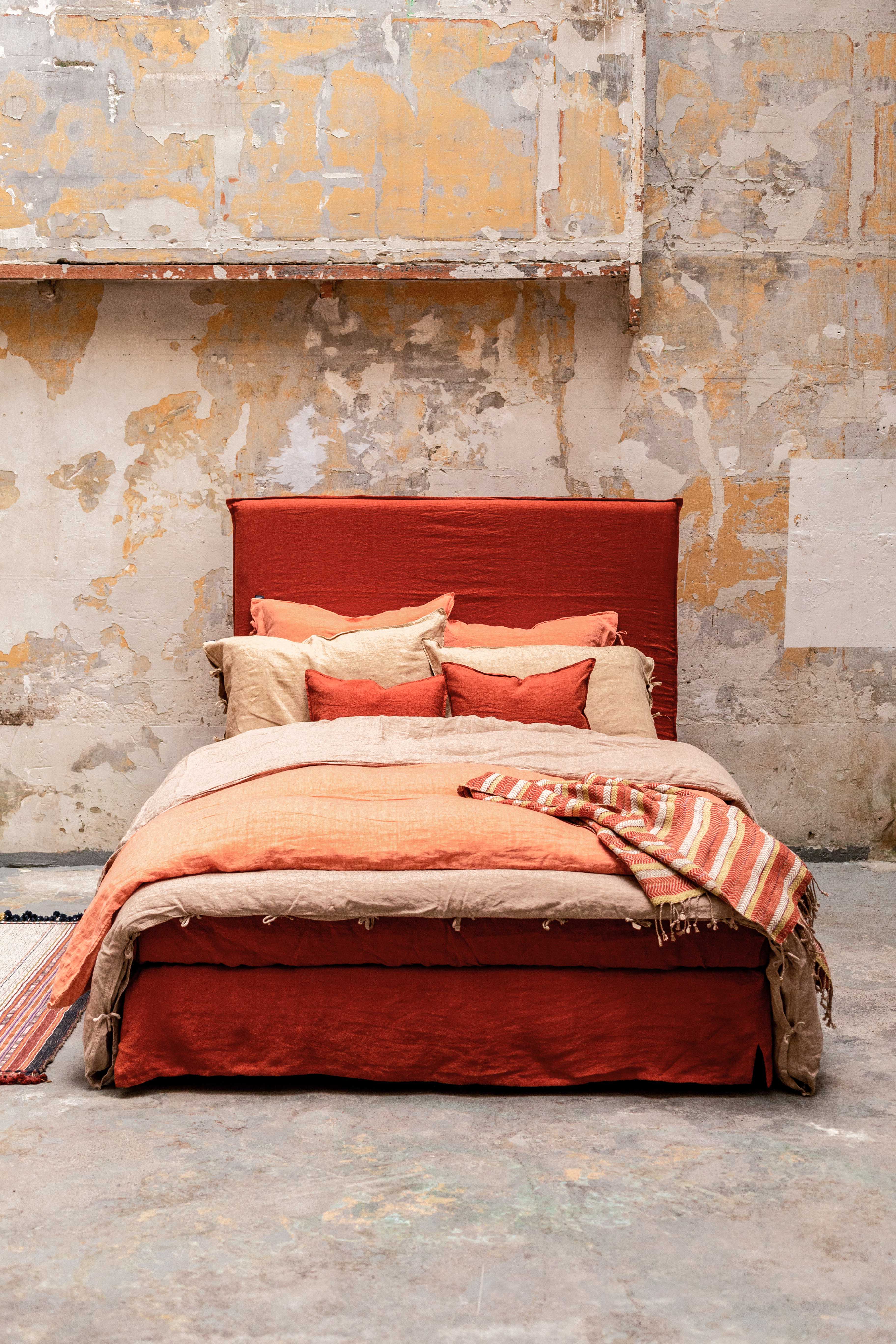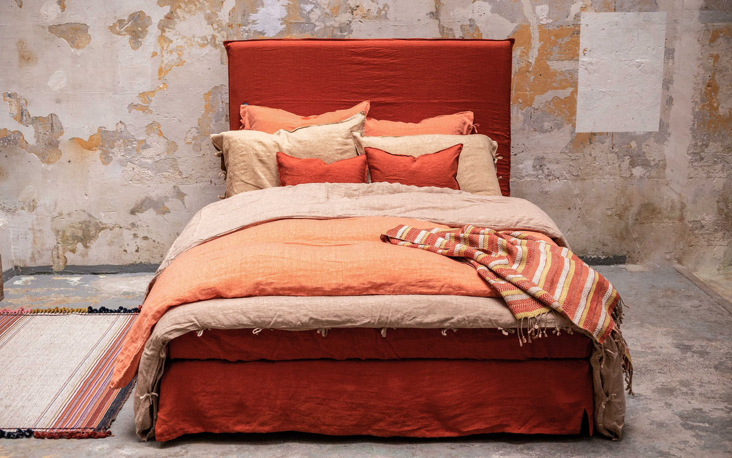 La richesse de sa gamme de couleurs : 64 teintes irrésistibles, à choisir parmi les couleurs de la gamme Selena en lin lavé. Son côté aérien et léger : la tête de lit biseautée permet d’obtenir une ligne fine à souhait, avec un volant craquant qui vient ponctuer le tour de la housse. Sa versatilité : facile à vivre, Holi est entièrement déhoussable. Vous pouvez le passer en machine facilement, et même envisager d’avoir deux couleurs fétiches à alterner pendant l’année pour changer de parure au fil des saisons. Sa fraîcheur : à la fois par sa matière, intemporelle et légère, mais aussi par ses couleurs unies, qui se marient évidemment à notre linge de lit Selena. Son inspiration : Holi, c’est la fête des couleurs en Inde. Une invitation à s’amuser avec les teintes, et se réinventer sans cesse, pour une chambre qui vous accueille en fanfare, selon vos envies.