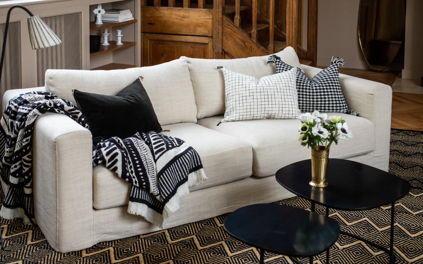 Le plaid Treya est une véritable ode à l’artisanat traditionnel, confectionné à la main dans des ateliers du nord de l'Inde. Tissé avec soin dans un mélange de laine mérinos, de lin et de coton, il se distingue par ses lignes graphiques noires et blanches qui créent des motifs audacieux et harmonieux, apportant du caractère à votre espace. Chaque plaid nécessite entre 4 et 5 jours de travail minutieux de la part de nos artisans tisserands et brodeurs, témoignant du savoir-faire ancestral qui se perpétue dans ces ateliers. Ce plaid, à la fois moderne et artisanal, est un hommage à la beauté des textiles faits main, capable d’apaiser l’œil tout en réchauffant le corps.